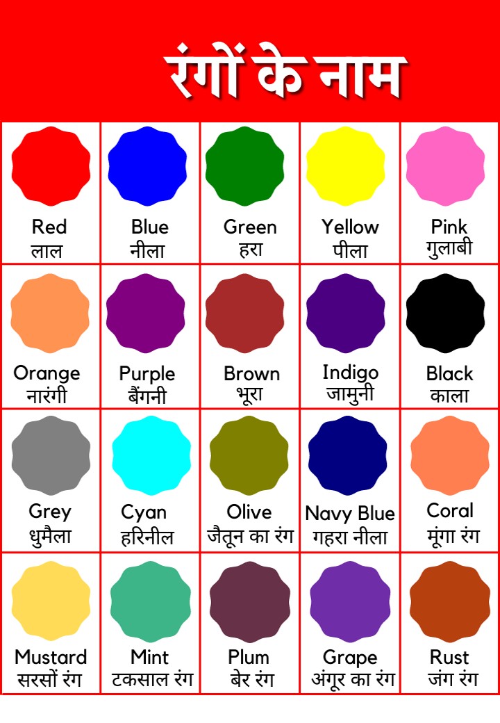 | क्र.सं. | Colors Name in English | Colors Name in Hindi | Color Image |