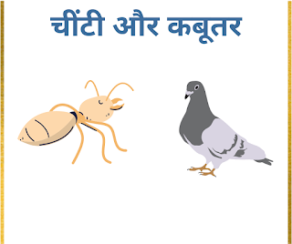 गर्मियों के एक गर्म झुलसा वाले दिन, एक चींटी पानी की तलाश में इधर-उधर घूम रही थी। कुछ देर इधर-उधर घूमने के बाद, उसने एक नदी देखी और उसे देखकर प्रसन्न हो गई। वह पानी पीने के लिए एक छोटी चट्टान पर चढ़ गया, लेकिन वह फिसल कर नदी में गिर गया। वह डूब रही थी लेकिन पास के पेड़ पर बैठे एक कबूतर ने उसकी मदद की। चींटी को मुसीबत में देखकर, कबूतर ने जल्दी से पानी में एक पत्ता गिरा दिया। चींटी पत्ती की ओर बढ़ी और उस पर चढ़ गई। कबूतर ने सावधानी से पत्ती को बाहर निकाला और उसे जमीन पर रख दिया। इस तरह, चींटी की जान बच गई और वह हमेशा के लिए कबूतर की ऋणी हो गई।